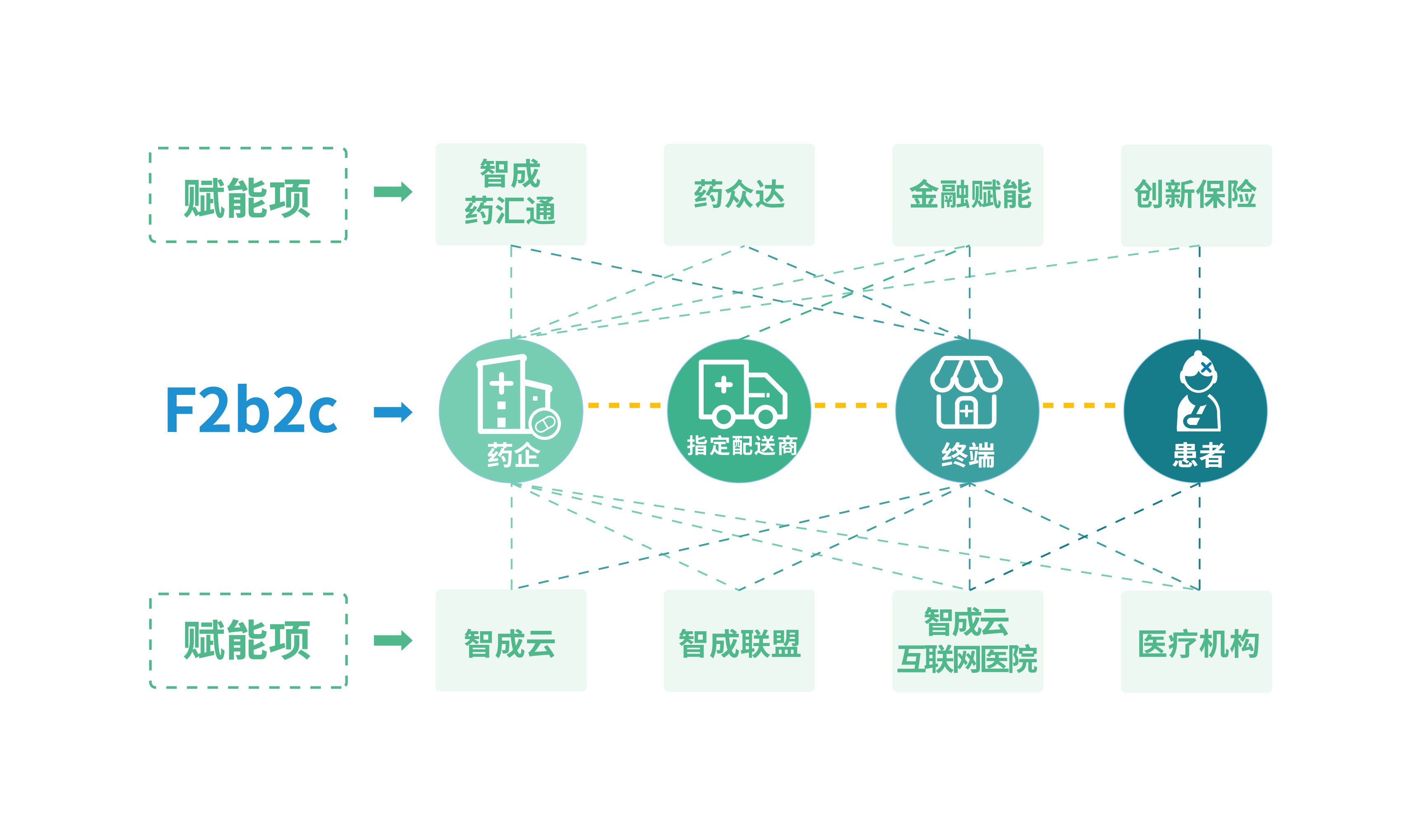 提供F2b2c醫藥全流通解決方案,在藥品與患者之間,架起重要的連通、推廣及用戶教育的作用。同時,線上效率提升、流程透明的特點利于各環節的優化主要項目包括智成藥匯通,智成云,藥眾達以及智成聯盟。智成藥匯通提供F2b2c醫藥供應鏈第三方交易平臺,智成云醫藥“新零售”全產業鏈生態系統,藥眾達人員管理及整合醫藥人推廣業務的裂變平臺,智成聯盟用大數據集合單體藥店優化整體供應鏈交易。