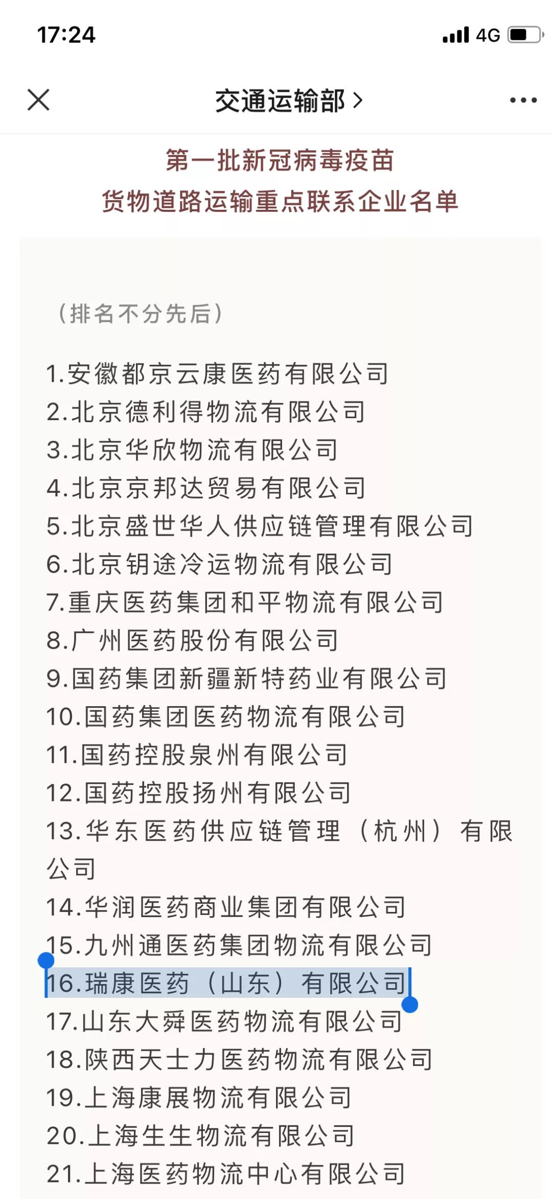 瑞康醫藥(山東)精品国产91-国产91 在线播放-国产91在线播放-91亚洲国产入選交通部 “第一批新冠疫苗運輸企業公示”名單
