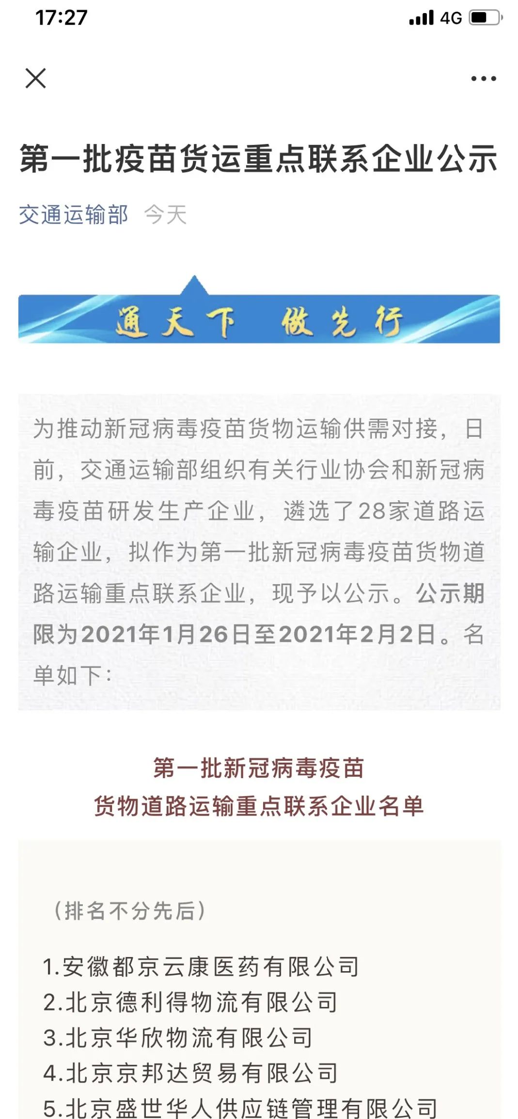 公司將嚴格遵守交通運輸部下發的《新冠病毒疫苗貨物道路運輸技術指南》的要求,標準化運營、合規化操作、統一化管理,為抗擊新冠疫情盡到醫藥物流人的責任與使命。